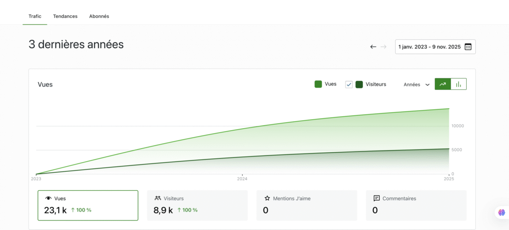 • À partir d’avril–mai 2023, le site a commencé à attirer plusieurs dizaines de visiteurs par mois.