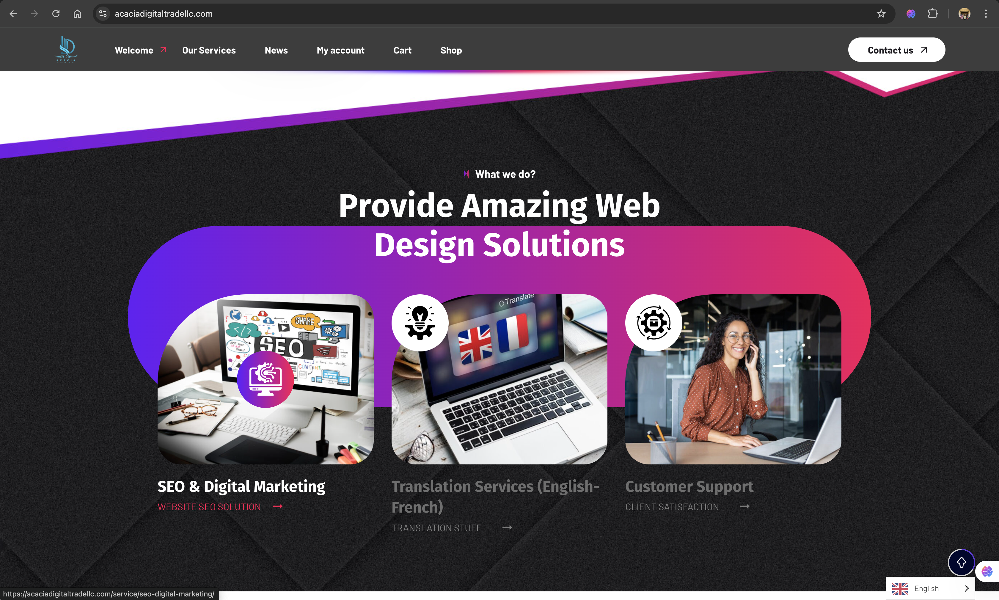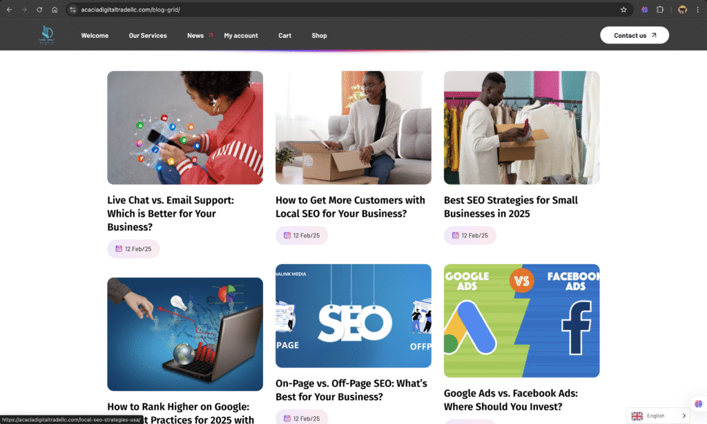 Acacia Digital Trade LLC est une entreprise opérant sur le marché international et ayant besoin d’une présence digitale solide, professionnelle et capable d’inspirer confiance auprès de ses partenaires. L’objectif était clair : concevoir un site corporate moderne, parfaitement structuré, et optimisé pour le référencement naturel international.